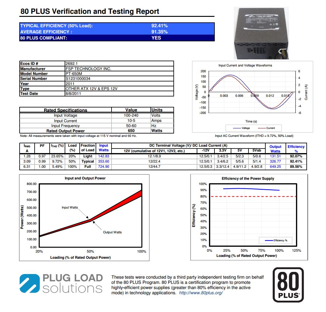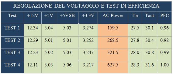 In questo capitolo prenderemo in esame alcuni dei fattori fondamentali per un alimentatore, l’efficienza e la stabilità sul canale dei 12V, quindi tutto ciò che riguarda la stabilità delle tensioni per la scheda madre, la CPU ed infine la scheda grafica. Al fine di darvi un giudizio complessivo migliore, anche riguardo l’efficienza dell’unità, vi riportiamo anche il test effettuato dall’azienda Plug Load Solutions, test che ne ha permesso la certificazione 80 plus presso l’organizzazione 80plus.org, ente che certifica tutti gli alimentatori immessi nel mercato.